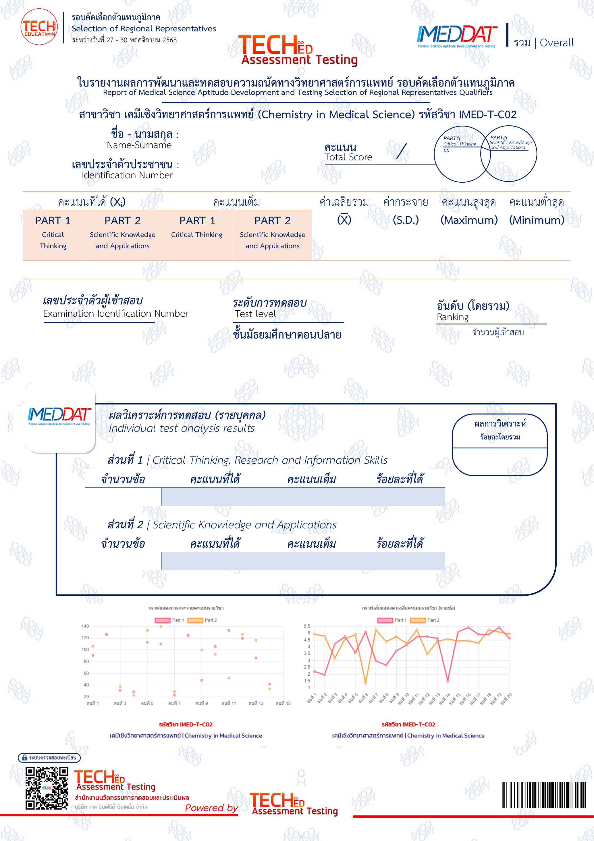 - ส่วนที่ 2 (PART 2) | Scientific Knowledge and Applications | ประกอบด้วย กึ่งปรนัย 20 ข้อ จำนวน 5 ตัวเลือก (ข้อละ 7 คะแนน) รวมจำนวน 20 ข้อ รวม 140 คะแนน