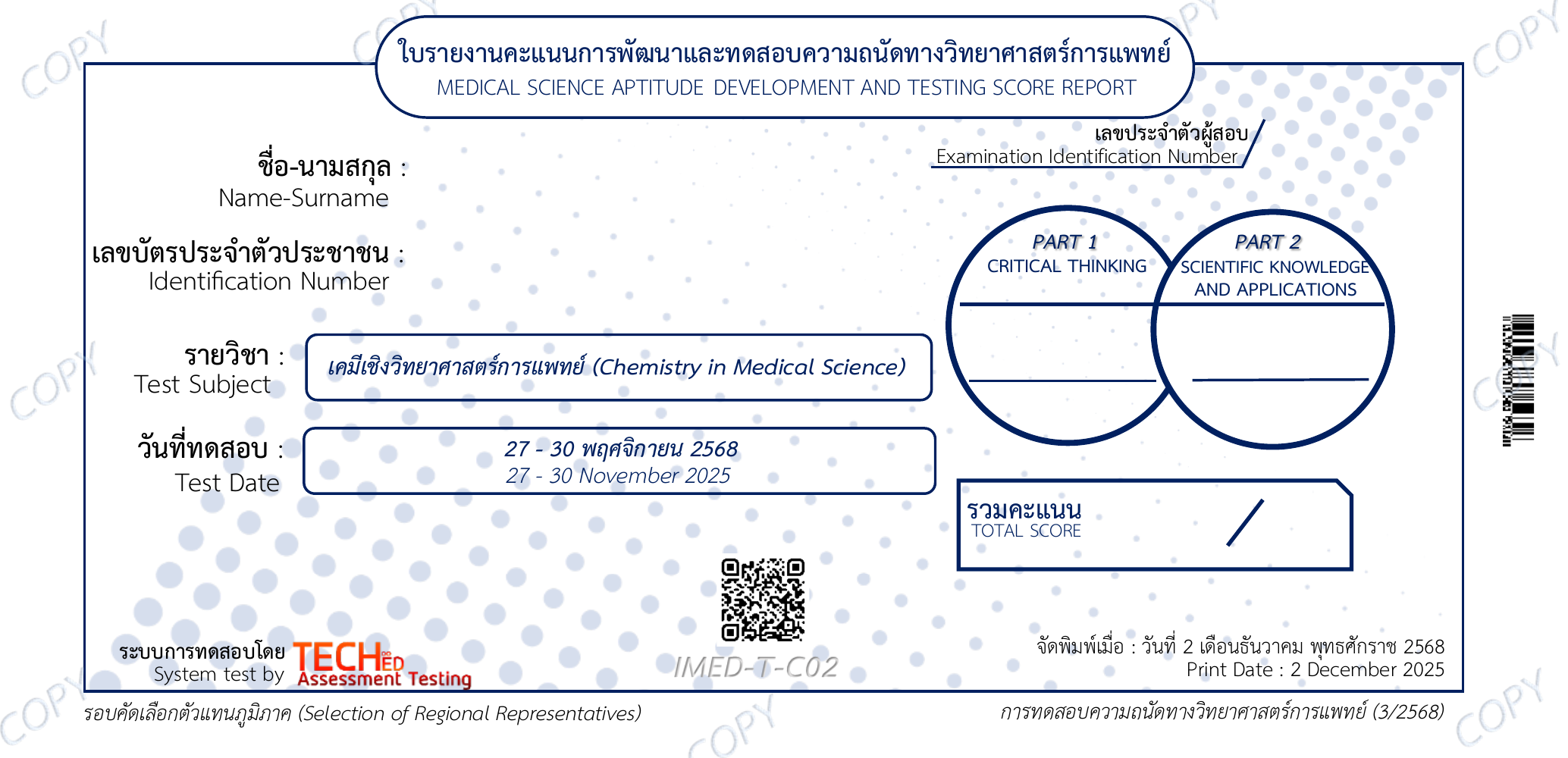 4. รายวิชา เคมีเชิงวิทยาศาสตร์การแพทย์ | Chemistry รหัสวิชา IMED-T-C02 รวมทั้งหมด 40 ข้อ ประกอบด้วยข้อสอบ 2 ส่วน ได้แก่