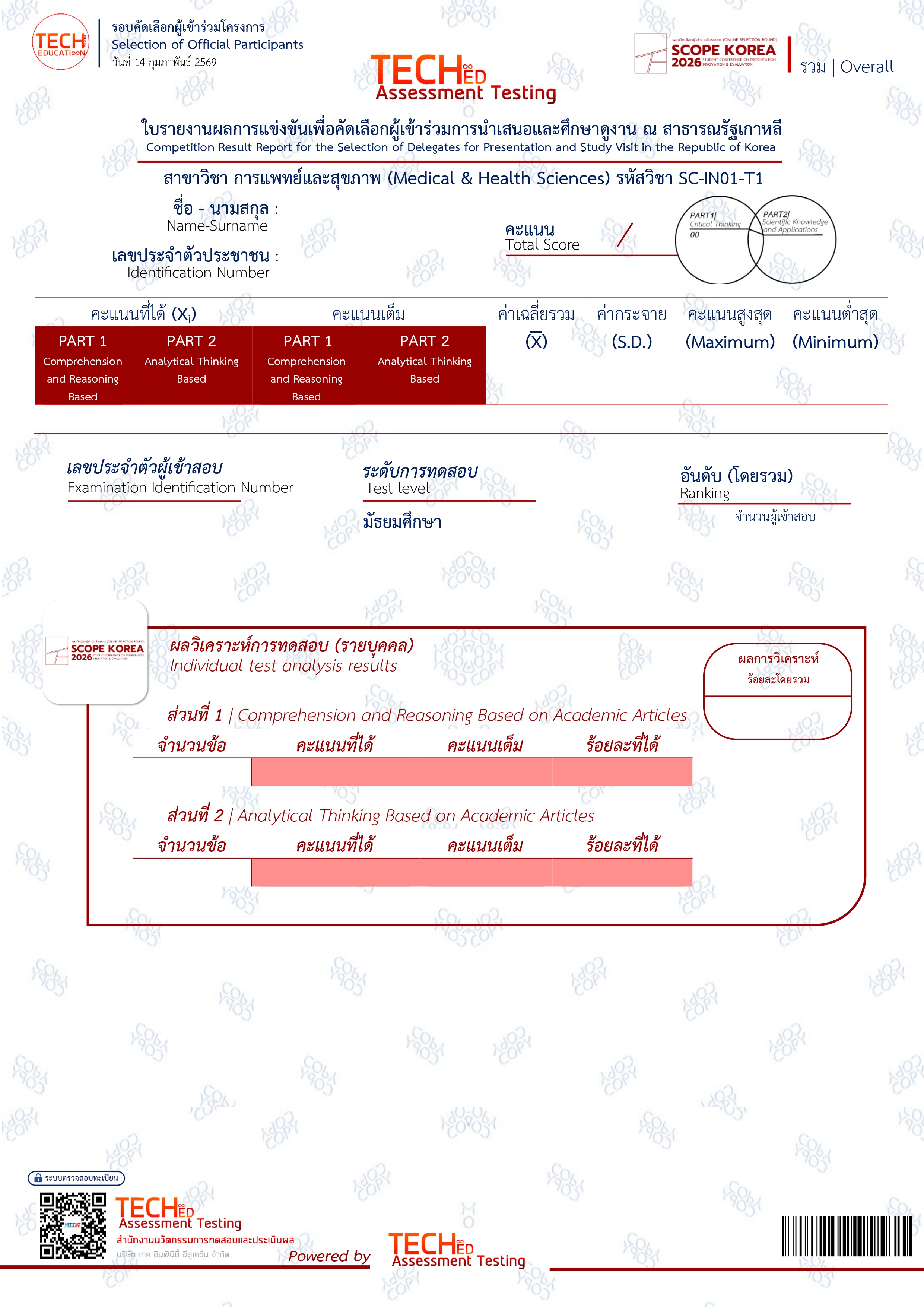จุดมุ่งหมายของการสอบ:เพื่อคัดเลือกนักเรียนที่มีศักยภาพเข้าสู่รอบนำเสนอผลงานนานาชาติและศึกษาดูงาน ณ กรุงโซล ประเทศเกาหลีใต้โดยรอบแรกนี้จัดขึ้นเพื่อประเมินทักษะความเข้าใจเชิงลึก ความคิดวิเคราะห์ และความสามารถด้านวิชาการทางการแพทย์เกณฑ์การประเมินเบื้องต้น:คะแนนรวม 280 คะแนน | คัดเลือกนักเรียนที่มีคะแนนสูงสุด 30 อันดับแรกเข้าสู่รอบชิงชนะเลิศเพื่อแข่งขันการนำเสนอผลงาน Innovation Showcase ณ COEX Convention Center กรุงโซล ประเทศเกาหลีใต้สิทธิประโยชน์ของผู้สมัครได้รับเกียรติบัตรเข้าร่วมการแข่งขันระดับประเทศทุกคนผู้ที่มีคะแนนมากกว่า 50% มีสิทธิ์ เข้ารับการสัมภาษณ์เพื่อศึกษาต่อต่างประเทศ (ยกเว้นค่าลงทะเบียนสัมภาษณ์ มูลค่า 3,500 บาท)ผู้ที่มีคะแนนมากกว่า 80% และมีคะแนนสูงสุด 10 อันดับแรก เงินสนับสนุนการเข้าร่วมนำเสนอแนวคิดนวัตกรรมในโครงการฯ ณ ประเทศเกาหลีใต้ จำนวน 10,000 บาท